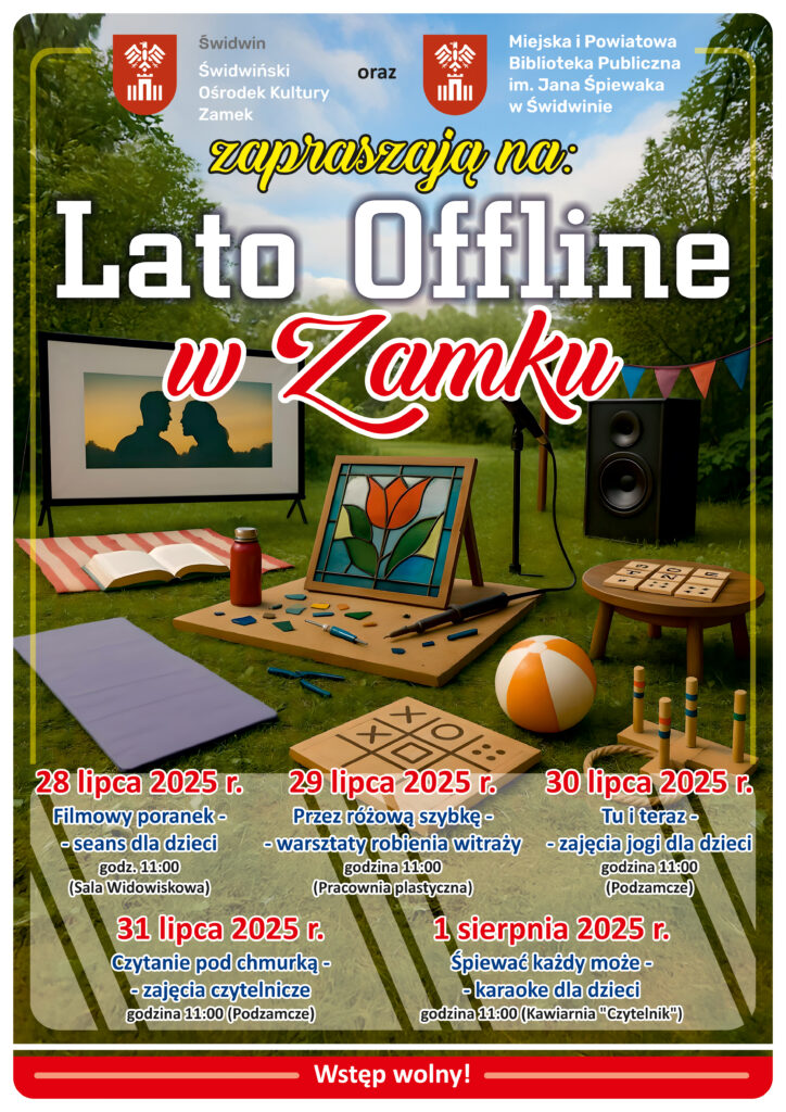 zamek 28 lipca 2025 71 Views Wrzucamy najnowszy rozkład zajęć w ramach “Lata offline w Zamku”. W tym tygodniu proponujemy Wam: Seans filmowy dla dzieci, Warsztaty robienia witraży, Zajęcia jogi dla dzieci, Zajęcia czytelnicze dla dzieci, Karaoke dla dzieci. Na wszystkie wydarzenia jest wstęp wolny, lecz liczba miejsc jest ograniczona. Więcej szczegółów na plakacie.