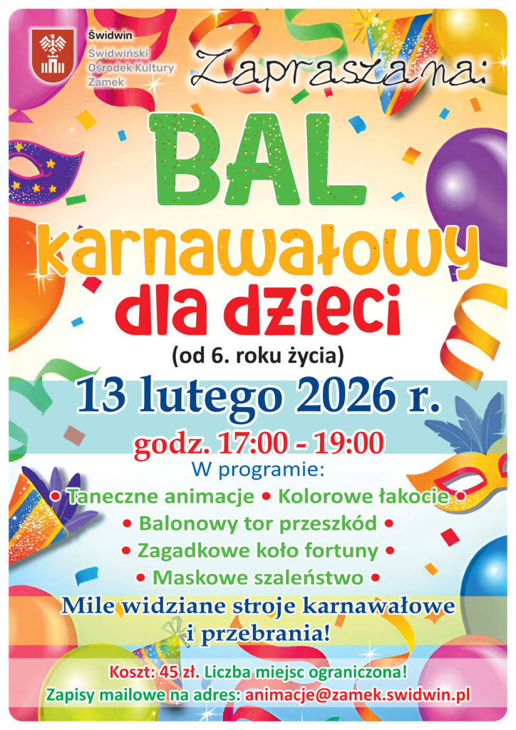 Gwarantujemy wieczór pełen muzyki i kolorowej zabawy. Bal przeznaczony jest dla dzieci od 6. roku życia.