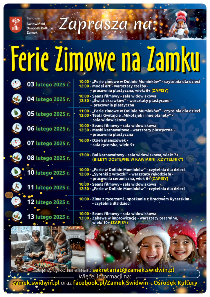 Zapisy na wybrane zajęcia (oznaczone na plakacie) tylko na e-mail: sekretariat@zamek.swidwin.pl
