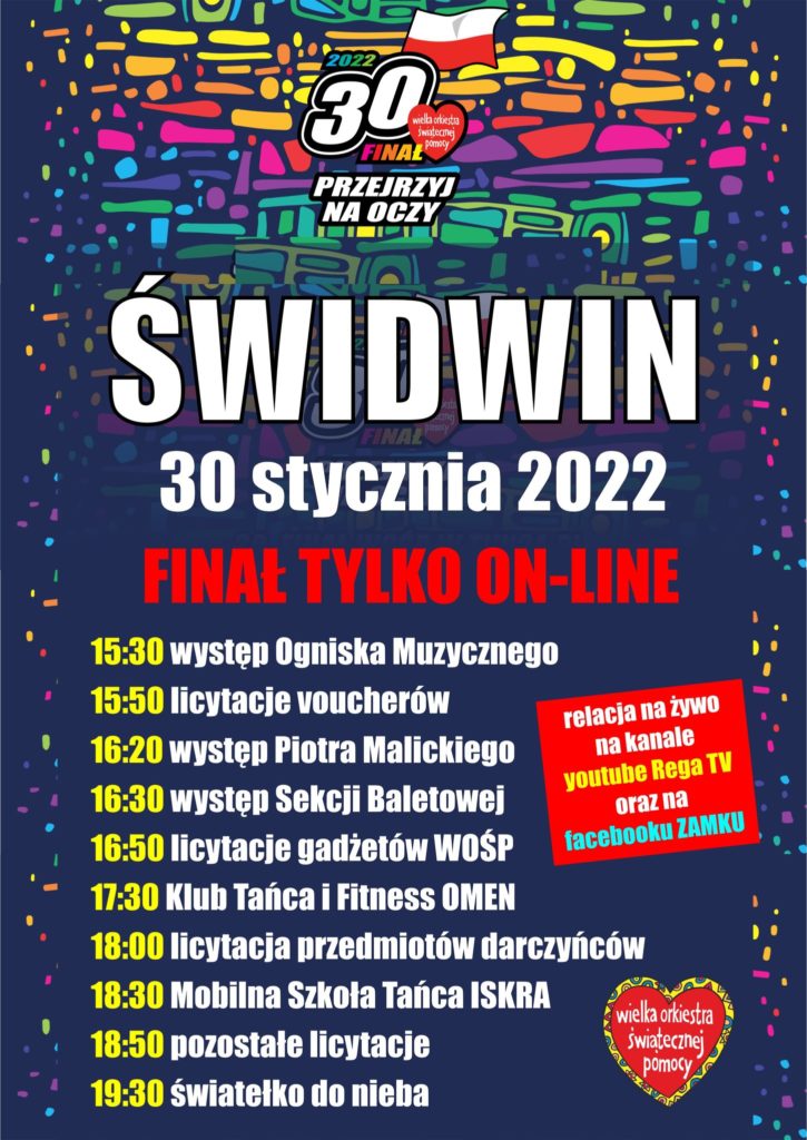 Mieliśmy ogromną nadzieję spotkać się z Państwem w sali widowiskowej, ale postanowiliśmy – jak w zeszłym roku – przenieść licytacje i relację z występów do onlajnu. Będzie można oglądać nas na żywo na zamkowym Facebooku i na kanale Rega TV w serwisie YouTube. Wolontariuszy będzie można oczywiście spotkać na ulicach miasta od godziny 9:00.
