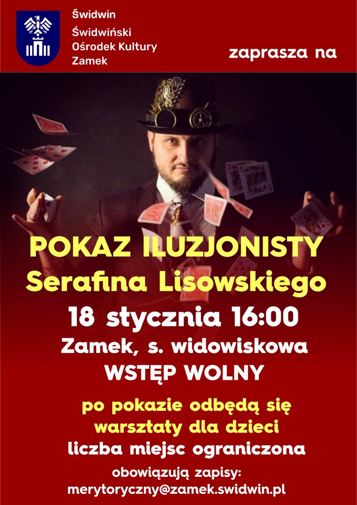 Kolejną atrakcją podczas ferii zimowych będzie pokaz iluzjonisty Serafina Lisowskiego, który wystąpi dla Was w czwartek 18 stycznia o godzinie 16:00 w sali widowiskowej świdwińskiego Zamku. Wstęp wolny!