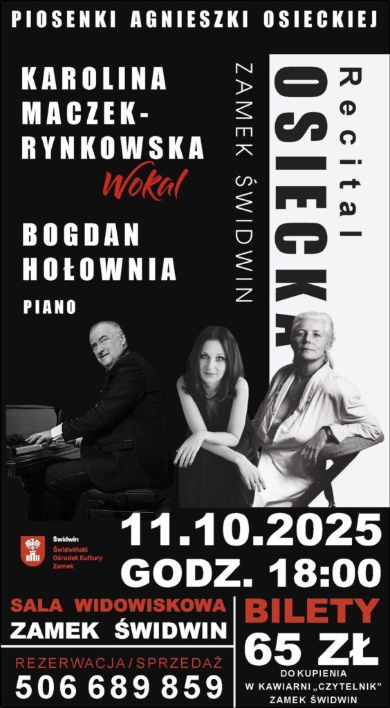 11 października 2025 r. o godz. 18:00 zapraszamy na “Recital z piosenkami Agnieszki Osieckiej” w wykonaniu Karoliny Maczek – Rynkowskiej oraz genialnego pianisty sceny jazzowej – Bogdana Hołowni.