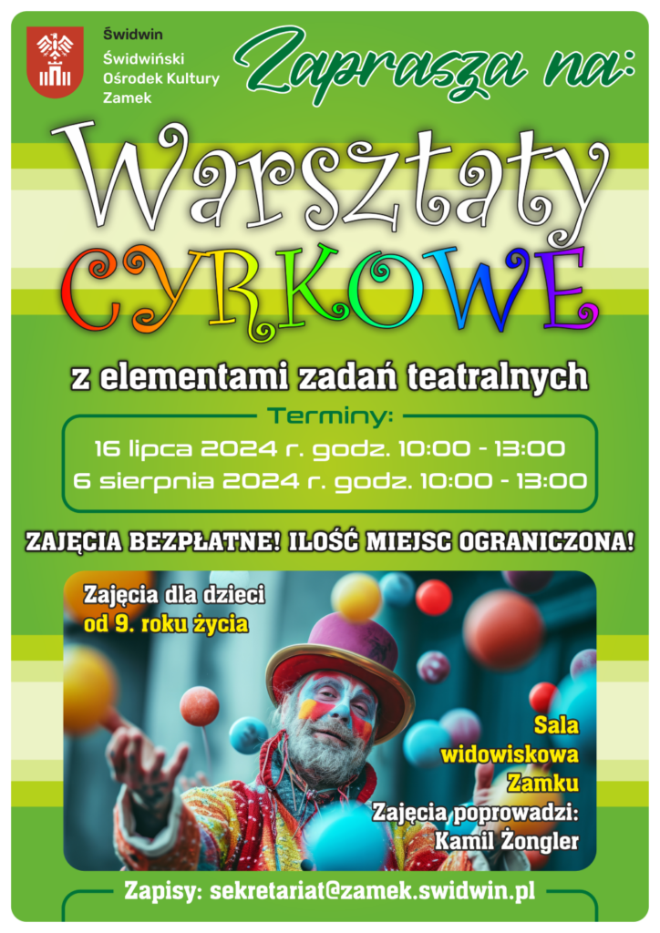 W tytule maila należy wpisać „Warsztaty cyrkowe” i wybrany termin, w treści maila należy przesłać imię, nazwisko, wiek dziecka oraz kartę zgłoszenia dziecka na warsztaty z klauzulą RODO – do pobrania poniżej (jest ona niezbędna do udziału w zajęciach).