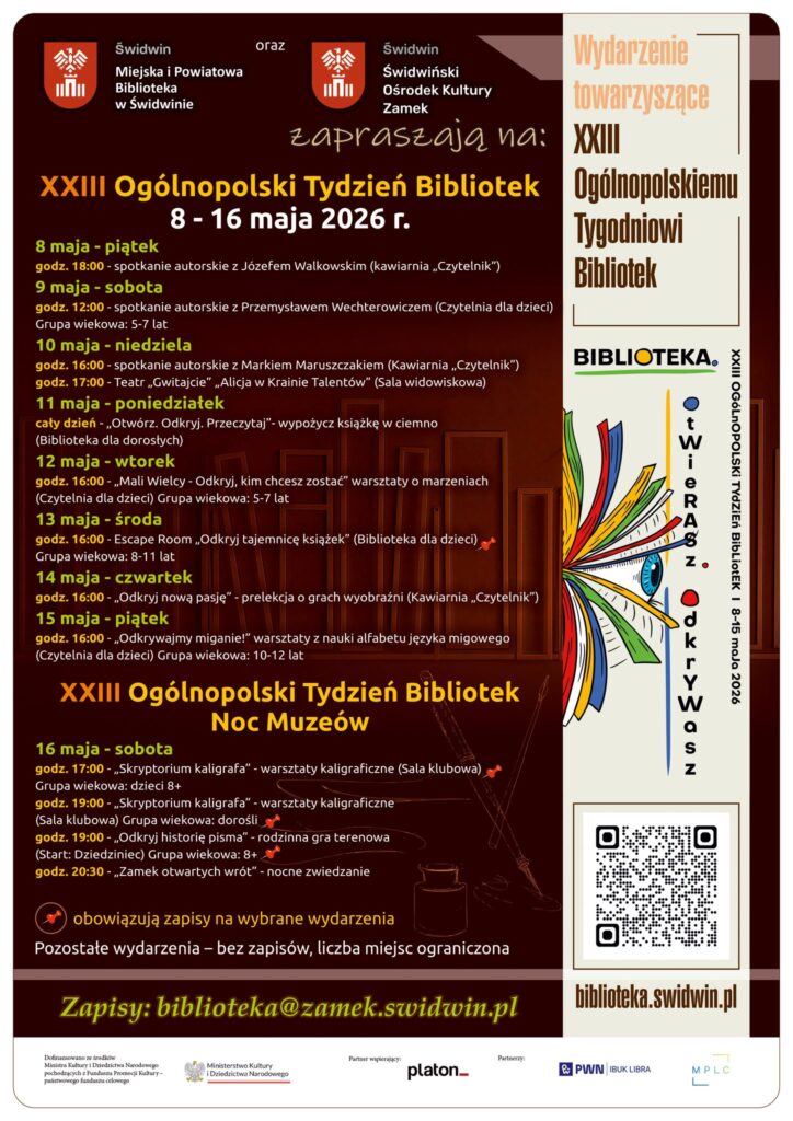 8–16 maja 2026 r. Miejska i Powiatowa Biblioteka Publiczna im. Jana Śpiewaka w Świdwinie zaprasza na XXIII Ogólnopolski Tydzień Bibliotek, a towarzyszyć mu będzie hasło:
